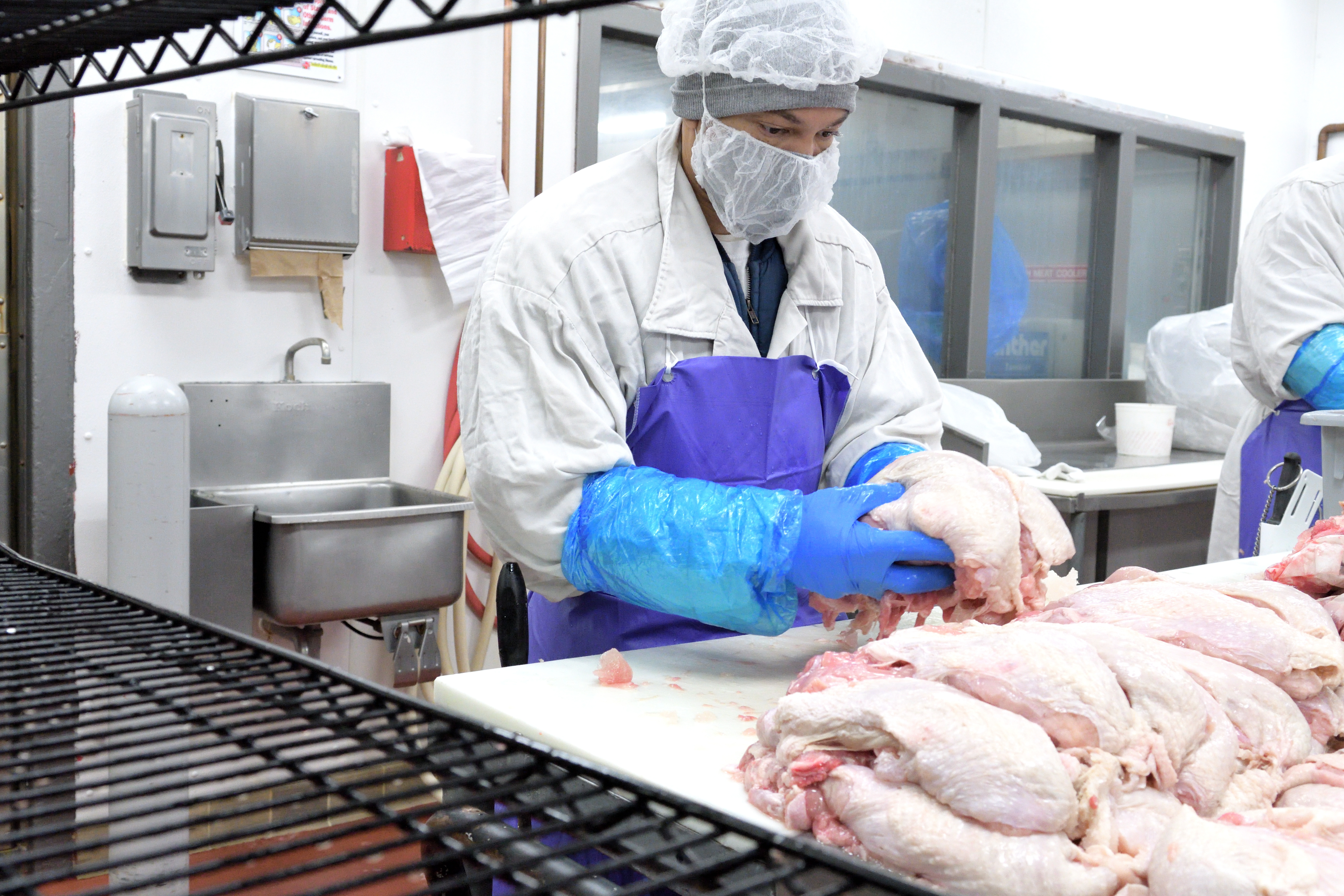 Once dropped off, the program participants begin preparing the turkeys for consumption. The turkeys are defrosted, injected with liquid turkey seasoning, deboned and parted by hand, and cooked in 3 smokehouses.